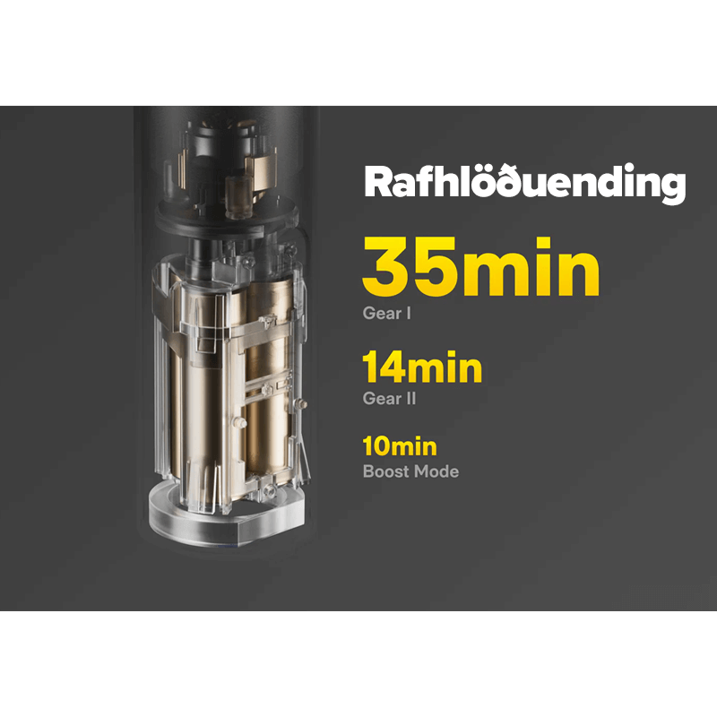 Innbyggð 2.500 mAh rafhlaða tryggir allt að 30 mínútna vinnutíma á einni hleðslu, þannig að auðvelt er að klára bílinn eða vinnustaðinn í einni lotu. Athugið að vinnutími fer eftir stillingu og sogkrafti.