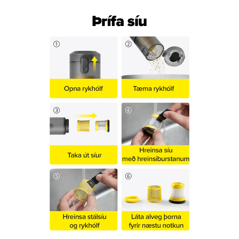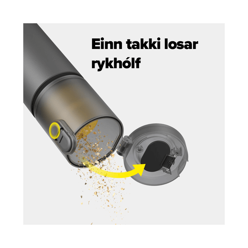 Háþéttni HEPA sía í rykhólfinu fangar fínt ryk og hjálpar til við hreinna andrúmsloft á meðan þú þrýfur. Auðvelt er að taka síuna úr til reglulegrar umhirðu.