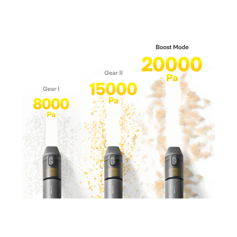 Tækið skilar allt að 20.000 Pa sogkrafti og 50 m/s lofthraða, þannig að það nær sandi, hárum og fíngerðu ryki bæði af sléttu yfirborði og úr þröngum hornum. Veldu milli Boost, Standard og Eco eftir því hvort þú vilt hámarksafköst eða lengri vinnutíma.