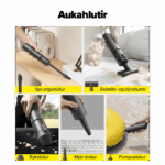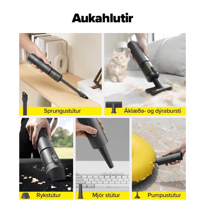 Með vörunni fylgir 5 aukahlutir: 2‑í‑1 aðalbursti, rykstútur, sprungustútur, mjór stútur til að pumpa í dýnur og sundlaugarleikföng og mjór blástursstútur. Að auki er rykhólf, lítill hreinsibursti, burðarpoki og hleðslusnúra – allt sem þarf til að hefja þrifin strax.