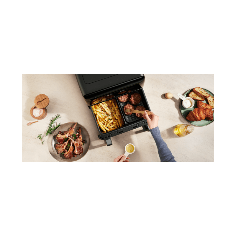 Þessi loftsteikingarvél er með stóra 9 lítra FlexZone™ körfu sem hægt er að nota sem eitt stórt svæði eða skipta í tvö 4.5 lítra svæði. Hún er með 2.700 W afl sem tryggir hratt og jafnt eldunarferli á 40-230° hita.