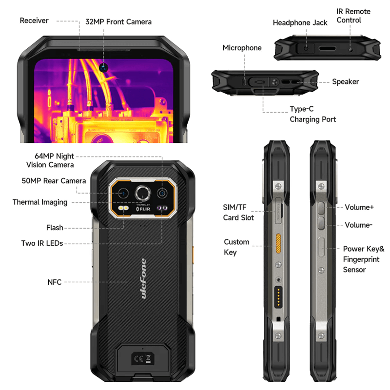 Ulefone Armor 27T Pro+ er öflugur og harðgerður snjallsími með innbyggðri FLIR 3.5 hitamyndavél, 64MP nætursjónarmyndavél og 50MP aðalmyndavél. Hann er með stóran 6.78″ 120Hz skjá, 10.600 mAh rafhlöðu og 24GB vinnsluminni ásamt 256GB geymsluplássi. Síminn er hannaður til að þola erfiðar aðstæður með IP68/IP69K og MIL-STD-810H vottun.