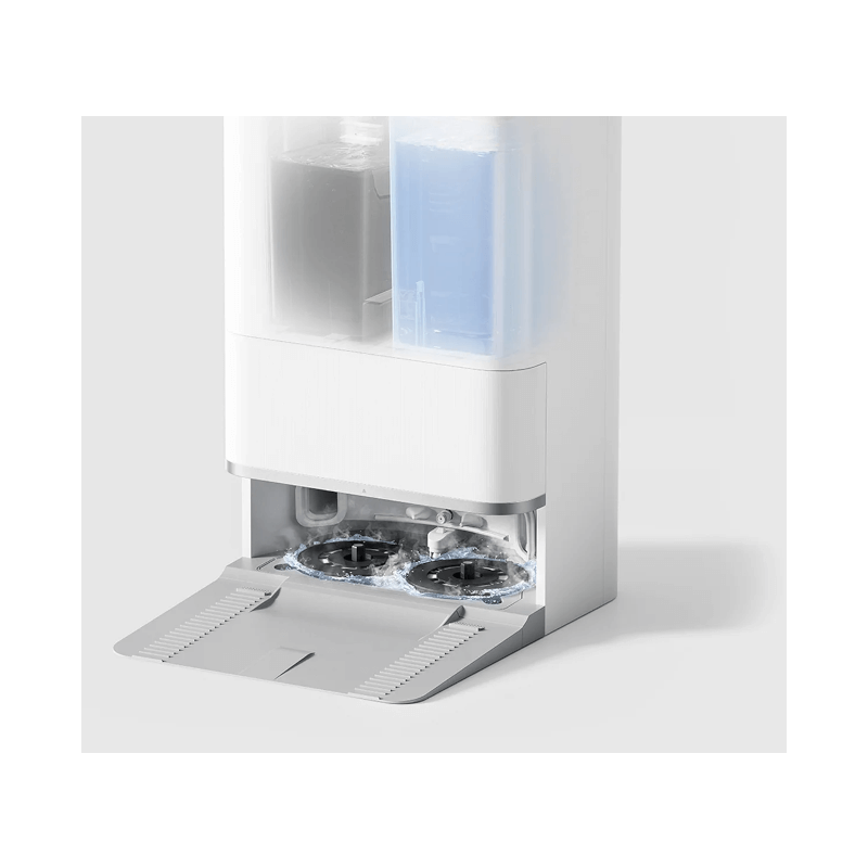 Sjálfhreinsandi hleðslustöðin tæmir sjálfkrafa ryk í 2.5 L rykpoka, þvær moppupúða með heitu vatni og þurrkar þá með heitu lofti á allt að 2 klukkustundum.