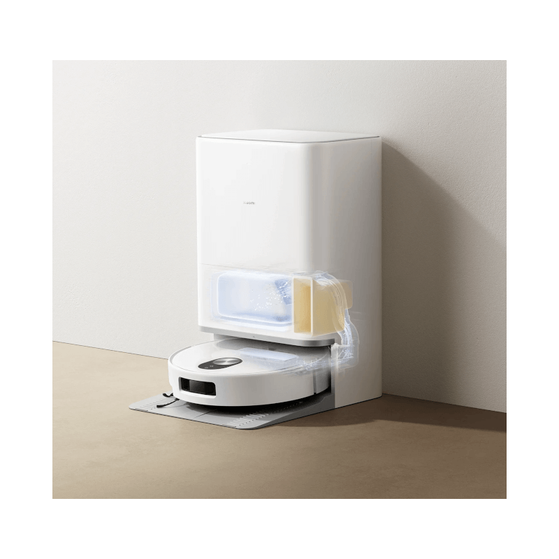 Xiaomi Robot Vacuum 5 EU styður bæði ryksugun og moppun. Moppupúðarnir eru þvegnir í allt að 80°C heitu vatni í sjálfhreinsandi stöðinni.