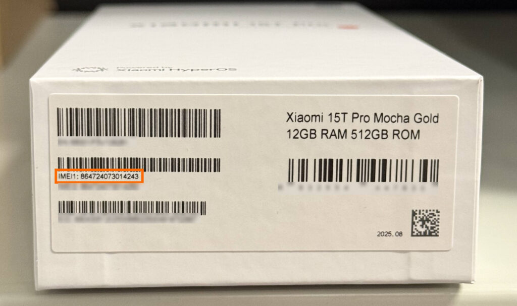 Á kassanum utanum tækið eru fjölmorg númer; strikamerki, seríalnúmer og IMEI1 og IMEI2 númer. Númerið sem þarf að stimpla inn hér fyrir ofan er IMEI1 (merkt með appelsínugulum kassa á dæminu hér fyrir neðan.)